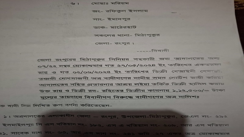 রংপুরের মিঠাপুকুর উপজেলার মির্জাপুর ইউনিয়নের ইসলামপুর গ্রামে বিক্রির জন্য জমির সম্পূর্ণ তথ্য গোপন করে দুটি পরিবারকে নিঃস্ব করার অভিযোগ উঠেছে। অভিযোগ অনুযায়ী, এর মাধ্যমে প্রায় ৬০ লাখ টাকার নির্মাণাধীন বাড়ি ও দোকানঘর উচ্ছেদের অভিযোগ তুলেছেন ভুক্তভোগী পরিবার।